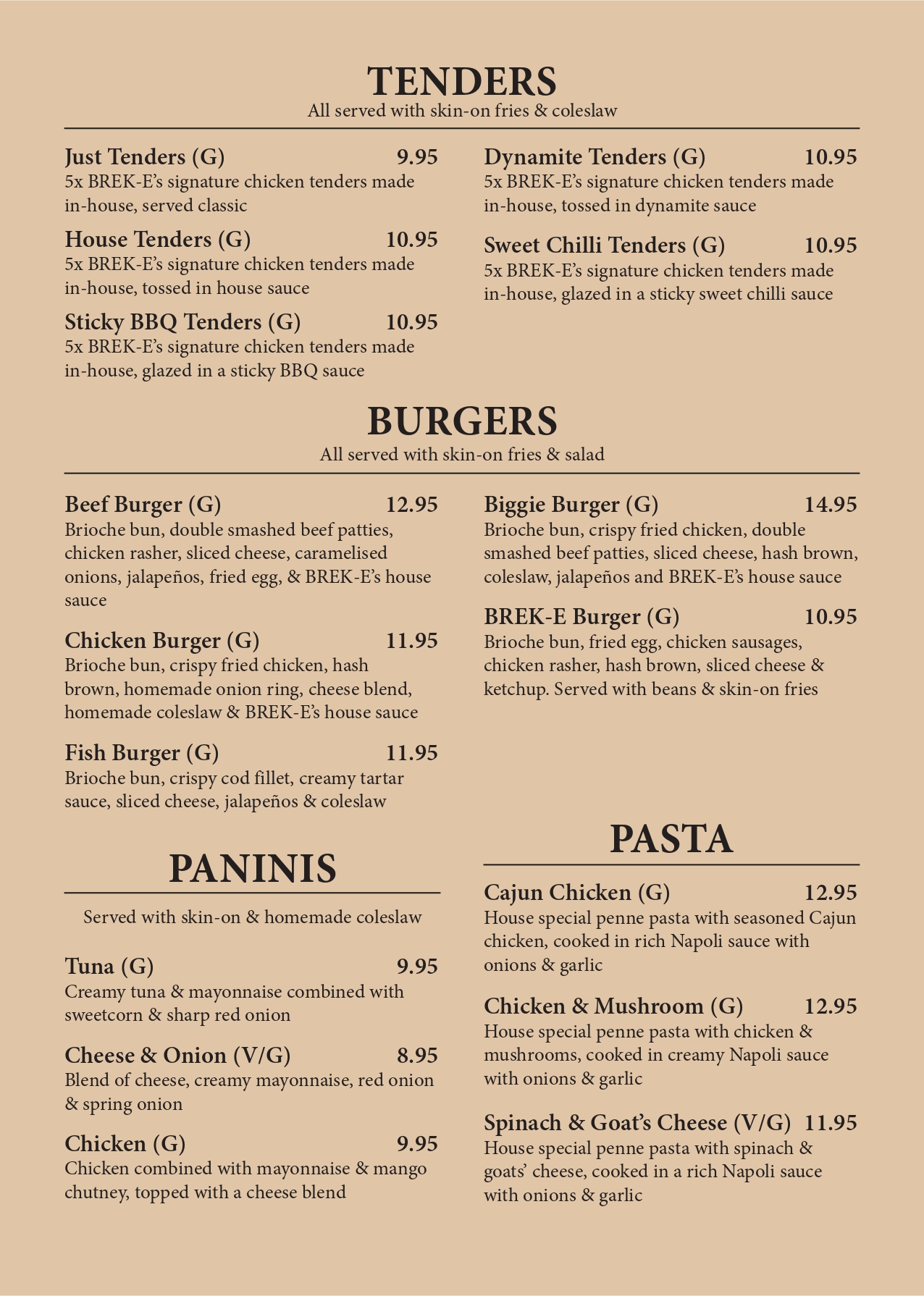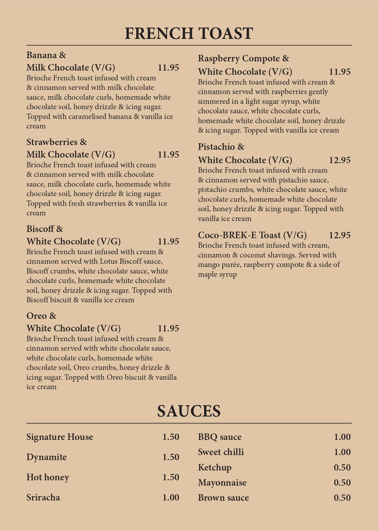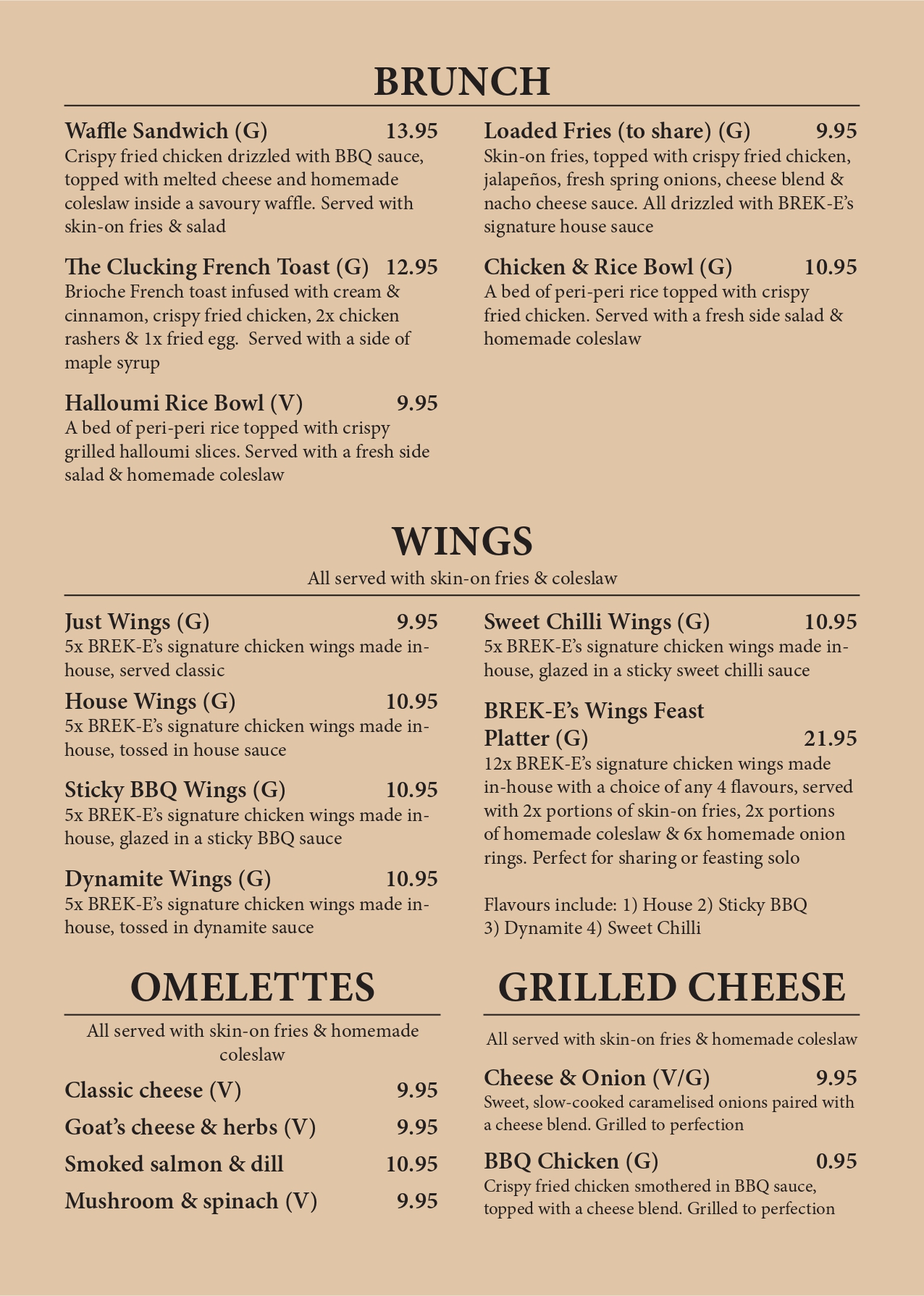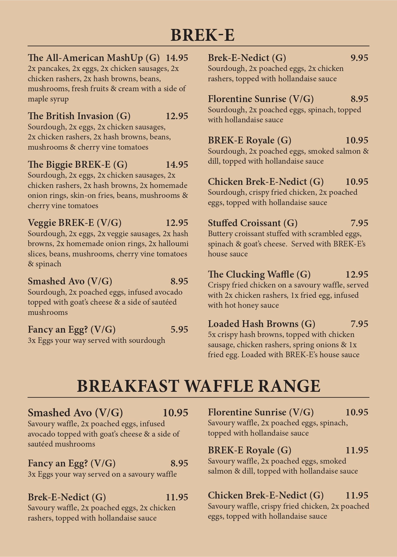 From hearty breakfasts to indulgent brunches, our menu is packed with customer favourites — fresh ingredients, generous portions, and a little Brek-e twist in every bite.